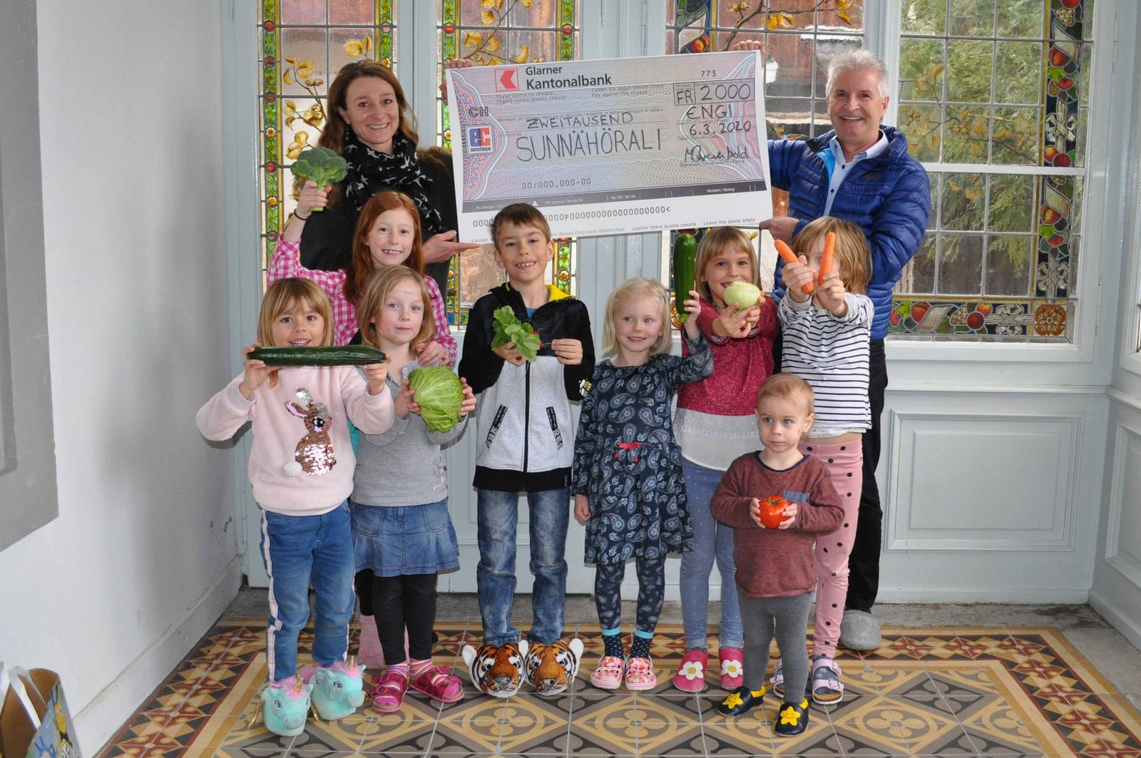 Marius Twerenbold, Präsident Kiwanis Glarus, übergibt den Check der stellvertretenden Präsidentin, Sandra Brandt, und den Kindern der Tagesstätte, die sich sehr freuen und bereits ihr Lieblingsgemüse in den Händen halten. Begeistert erzählen sie, warum sie gerne Gemüse essen, vor allem auch zum Zvieri. Im neuen Hochbeet werden sie Rüebli, Tomaten, Gurken, Kohlraben und vieles mehr anpflanzen, sobald die Saison beginnt. Sandra Brandt meint dazu, für die Kinder sei es eine sinnvolle Beschäftigung. Sie könnten so mehr erfahren, welches Gemüse gerade geerntet werden könne und damit den Bezug zum täglichen Essen in der Tagesstätte herstellen. Derzeit werden 27 Kinder betreut und der Alltag in der geschichtsträchtigen Villa, welche die Dorfgenossenschaft Engi der Kindertagesstätte vermietet, ist sehr lebhaft und fröhlich.